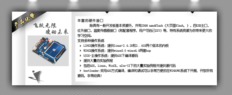 • 提供包括ADS、Linux、WinCE、uCos-II下的大量实验例程并提供源代码