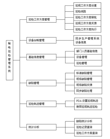 系统功能主要包括:输电工作方案管理、输电巡视卡管理、缺陷管理、巡视设置管理、查询统计、PDA现场巡视管理、系统管理、同步对接数据管理,如下图所示: